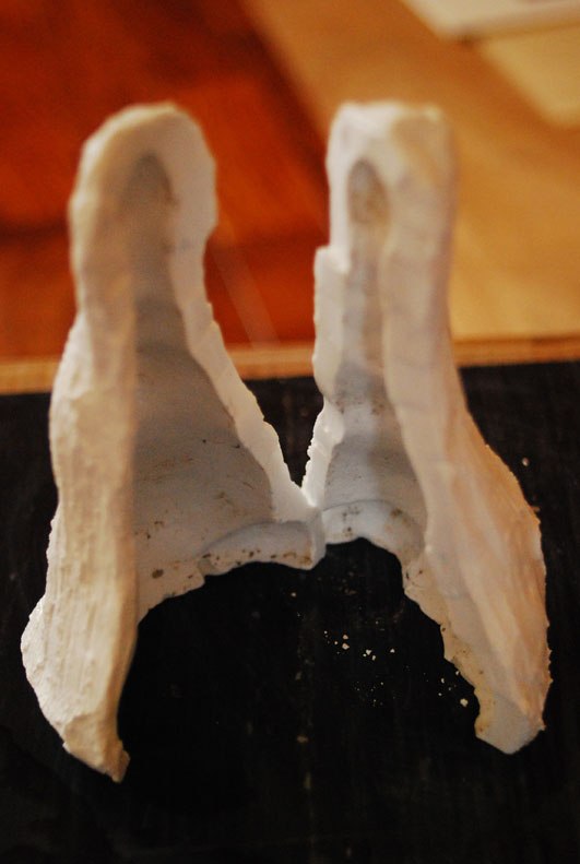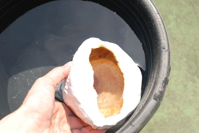 切り金のところで二つにに割り、中身の粘土を取り除きます。