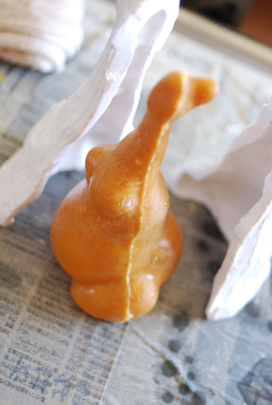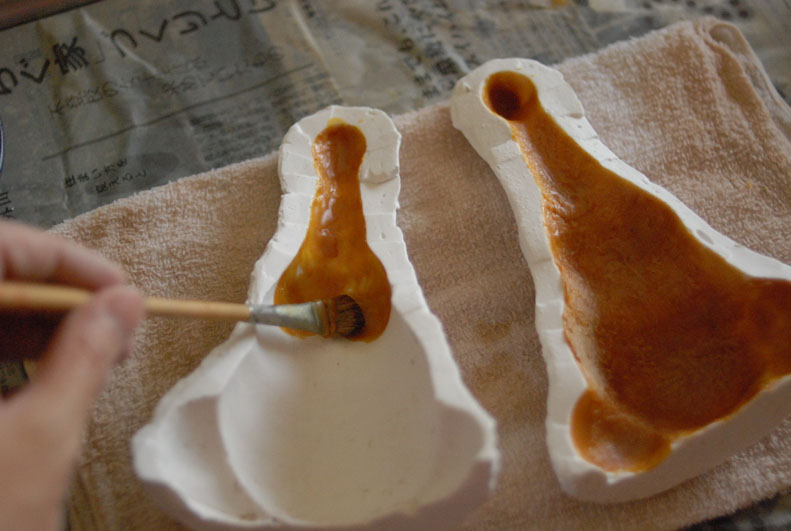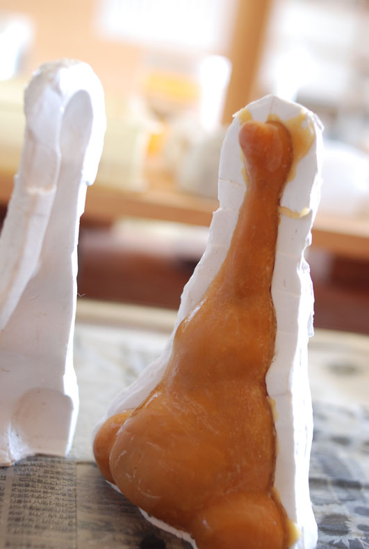 粘土で造形し、石膏で雌型を取り、内側に蝋を塗っていく方法です。